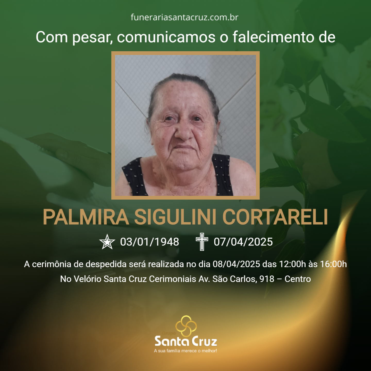 É com grande pesar que o Grupo Santa Cruz informa o falecimento de Palmira Sigulini Cortareli, 77 anos, ocorrido segunda-feira, 7, em São Carlos. Era viúva. Deixa os filhos Maria Magna, Rosangela, Cristiane e Julio Cesar (in memoriam), demais familiares e amigos.