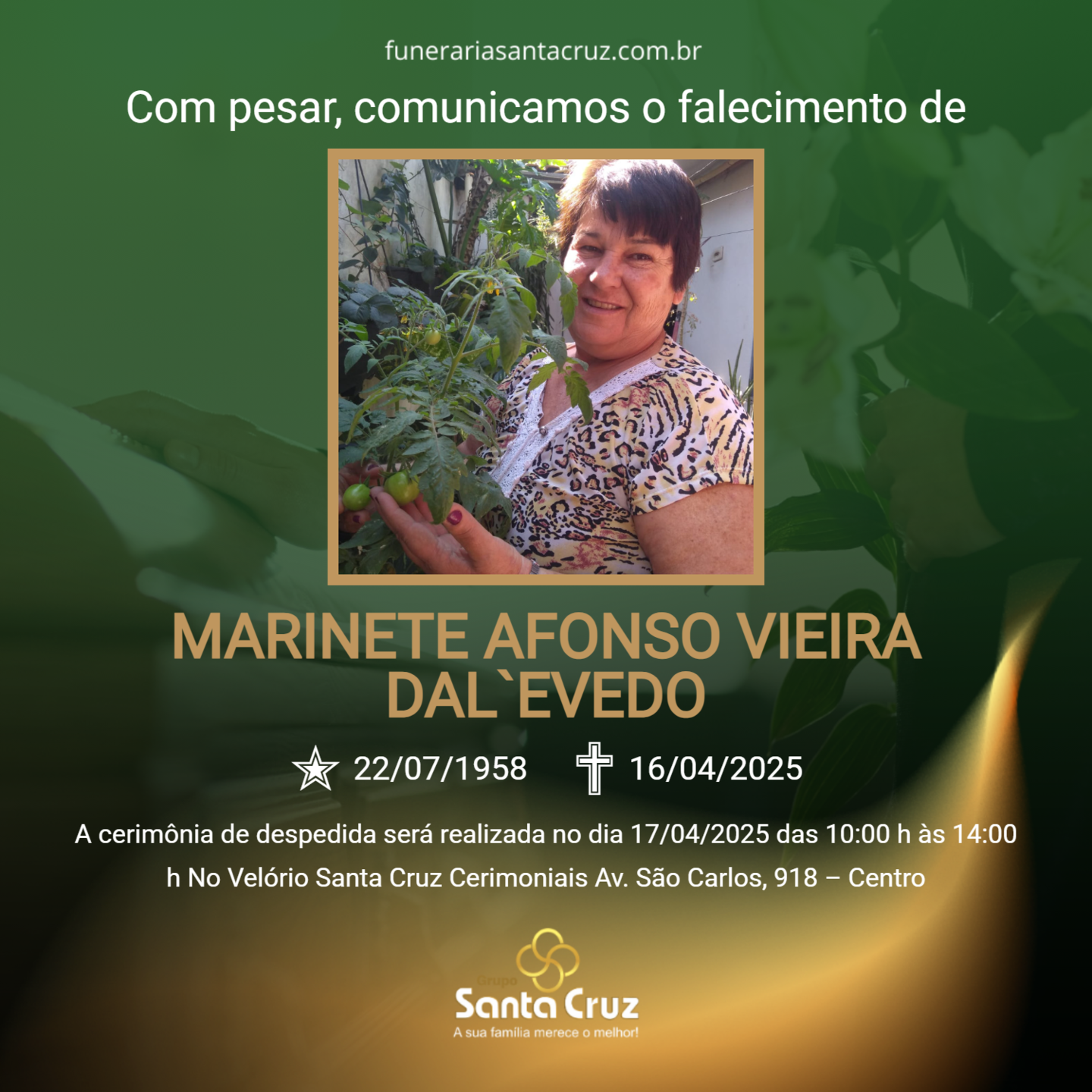 O Grupo Santa Cruz informou o falecimento de Marinete Afonso Vieira Dal’Evedo.