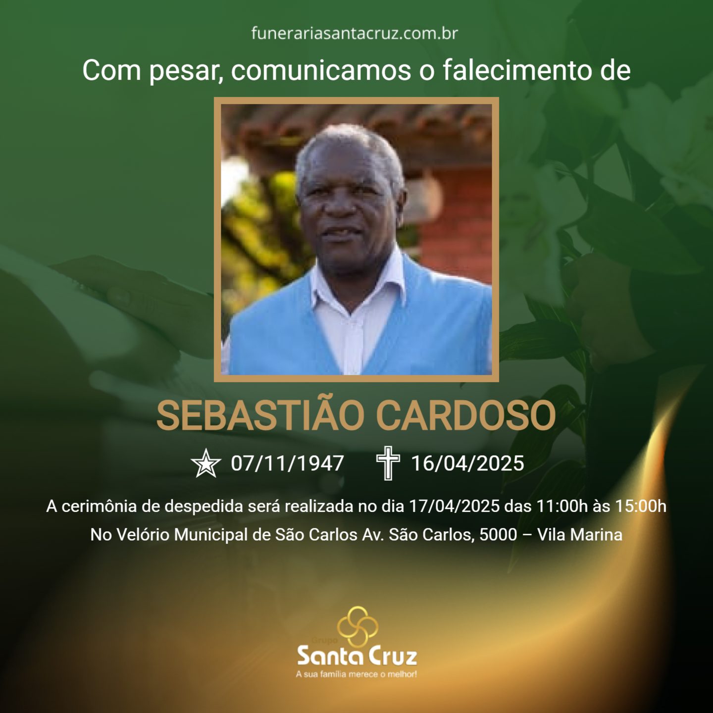 O Grupo Santa Cruz informou o falecimento de Sebastião Cardoso.