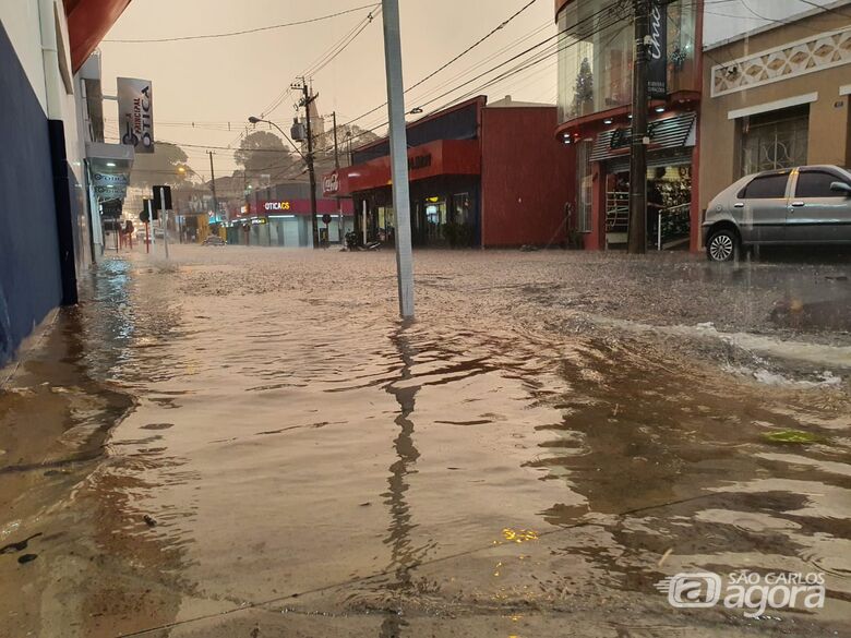 Por causa do temporal que atingiu a cidade no final da tarde desta sexta-feira (13), nas ruas do Centro ficaram alagadas.