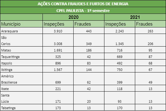 Dentro do combate contra fraudes e furtos, a CPFL Paulista realizou, no primeiro semestre de 2021, 51 ações de Segurança Patrimonial, registrou 1.145 boletins de ocorrência e 54 conduções de criminosos à delegacia.