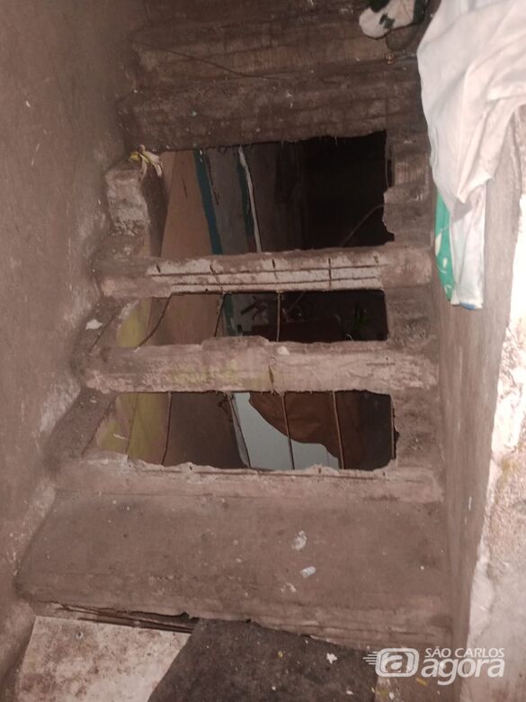 Em um dos “predinhos” (como são chamados os imóveis), a escada que dá acesso aos apartamentos do piso superior está se “desintegrando”, abrindo grandes buracos e o risco de acidentes, segundo ela, é imenso, pois fica uma grande lacuna entre um degrau e o outro. “A altura até o chão é de uns 4 ou 5 metros”, explicava a cuidadora.