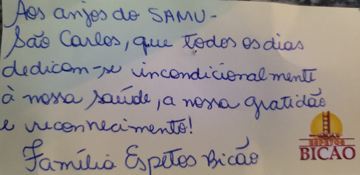 Diante de um gesto de carinho e reconhecimento, os socorristas do Samu entraram em contato com o São Carlos Agora para agradecer a atitude. “Isso faz com que a cada dia, possamos nos empenhar ainda mais em salvar vidas”, afirmaram os “anjos” da saúde.