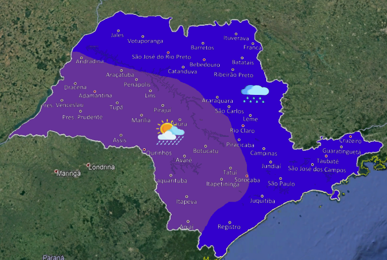 Uma nova frente fria chega ao estado de São Paulo, causando aumento da nebulosidade e áreas de chuvas mais generalizadas, algumas com forte intensidade e acompanhadas por trovoadas e descargas elétricas. Temperaturas entrarão en declínio a partir da noite.
