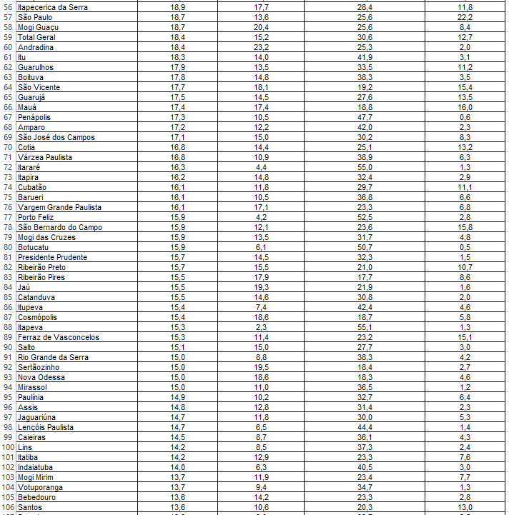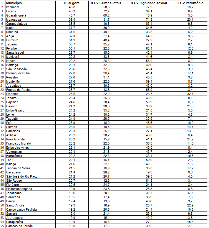De acordo com a edição mais recente, referente ao ano de 2018, e divulgada pelo jornal O Estado de S. Paulo, o município mais violento no Estado é Itanhaém, na Baixada Santista. O município menos exposto a crimes violentos é Vinhedo, na região de Campinas. Há 20 meses a cidade não registra um homicídio.