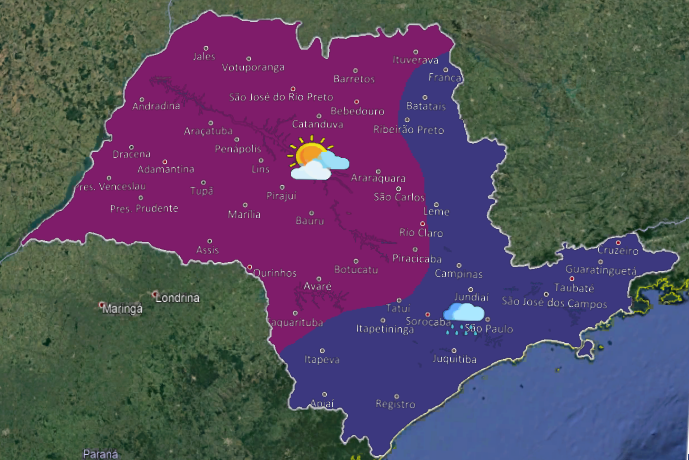 Frente fria se afasta do estado de São Paulo. Contudo, áreas de instabilidade ainda atuarão em parte do estado, devido à circulação dos ventos que transportam umidade, do oceano, em direção ao continente. Desta forma, há previsão de chuvas isoladas, principalmente nas regiões central, sul e leste paulista.