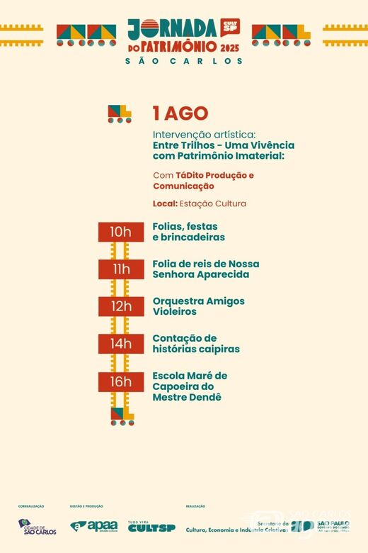 A Jornada do Patrimônio será realizada entre os dias 1 e 3 de agosto, com atividades em 40 municípios paulistas, incluindo Araraquara, Bauru, Jundiaí, Santos, São José do Rio Preto e Mogi das Cruzes. A programação inclui intervenções artísticas, debates, vivências em espaços históricos e feiras gastronômicas inspiradas nas antigas rotas de trem.