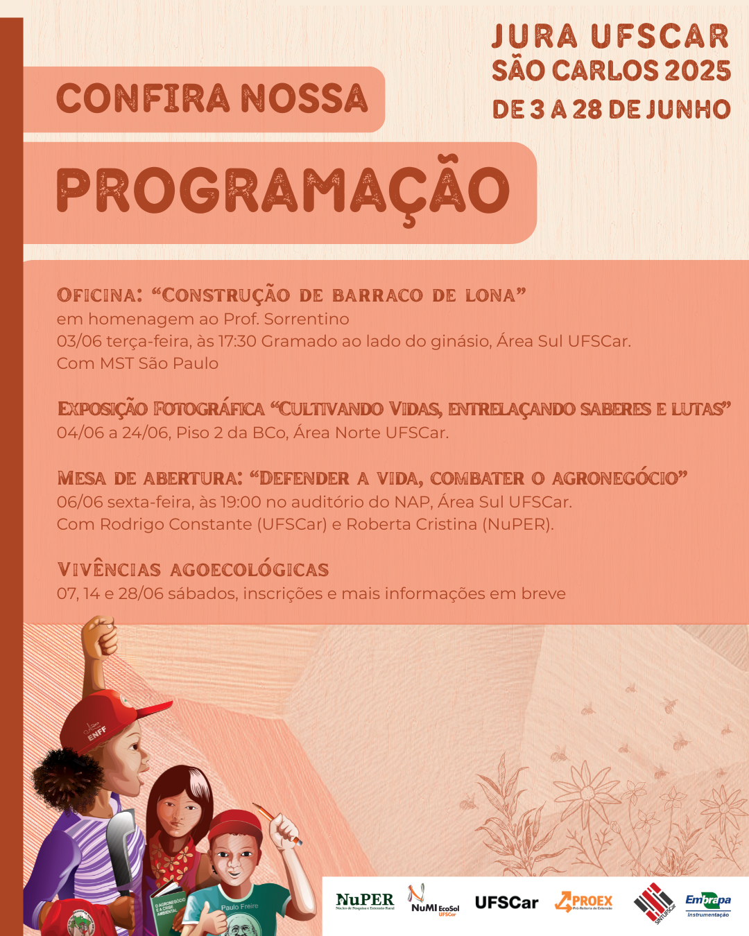 A programação inclui workshop no dia 3 de junho, às 17h30, ao lado do ginásio, área Sul do Campus São Carlos, sobre construção de barraco de lona, em homenagem ao professor Marcos Sorrentino, da Universidade de São Paulo (USP), em parceria com o MST São Paulo. De 4 a 24 de junho, acontece a exposição fotográfica "Cultivando vidas, entrelaçando saberes e lutas", no Piso 2 da Biblioteca Comunitária (BCo), área Norte.