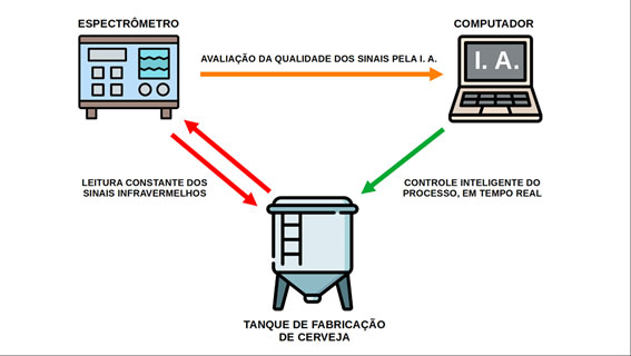 Um novo equipamento foi criado, um espectrômetro industrial para reações em fluxo contínuo, capaz de analisar minuciosamente todas as etapas de produção da cerveja dentro dos tanques. Utilizando sinais infravermelhos que atravessam a cerveja, o equipamento alimenta um computador com um sistema de IA que interpreta esses sinais em relação à qualidade esperada. Ao monitorar constantemente esses sinais, o computador toma decisões em tempo real para ajustar as condições durante o processo de produção, garantindo assim que o resultado final seja a melhor cerveja possível.