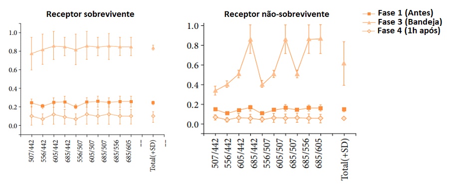 Os gráficos mostram as razões entre as diferentes regiões de emissão. À esquerda, observa-se um padrão que se mantém no caso de um paciente sobrevivente, enquanto, à direita, os padrões variam conforme a região de emissão, particularmente na fase de bandeja.