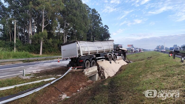 Local do acidente - Crédito: Maycon MaximinoUm acidente envolvendo uma carreta carregada com açúcar interditou totalmente a Rodovia Washington Luís (SP-310), na altura do km 219, em São Carlos, na madrugada desta segunda-feira (5). O acidente ocorreu no sentido interior–capital, próximo ao posto Graal Rubi.