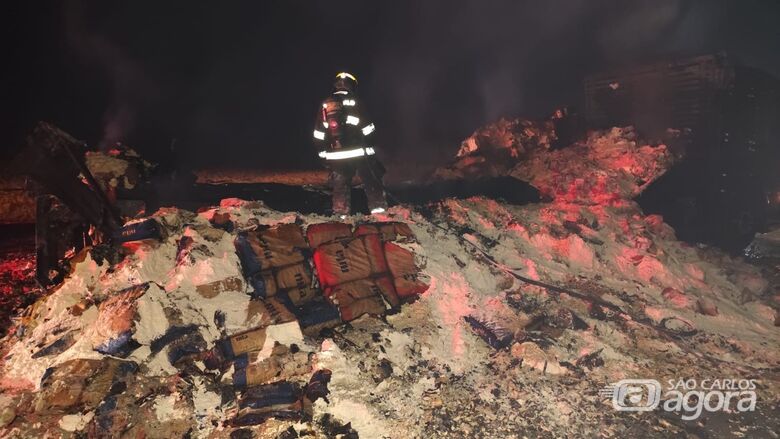 Na madrugada desta terça-feira (22), um caminhão carregado com farinha de trigo pegou fogo no km 244 da Rodovia Washington Luís (SP-310), na altura de Ibaté, sentido capital-interior.
