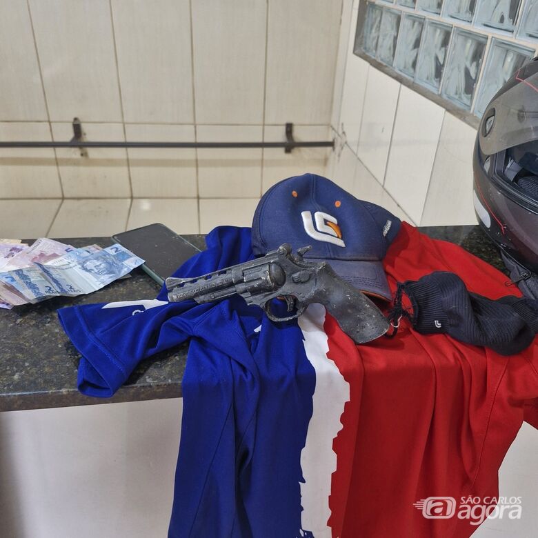 Durante a abordagem, os policiais encontraram no porta-malas um simulacro de arma de fogo, as vestes utilizadas no crime, dois capacetes e a quantia de R$ 638,00 roubada do comércio, além de objetos ligados a outros crimes. O homem confessou no local a autoria do roubo e revelou ainda a utilização de uma motocicleta Honda CG 160 Start vermelha, placa FNT-0G65, para outros roubos, especialmente a farmácias.
