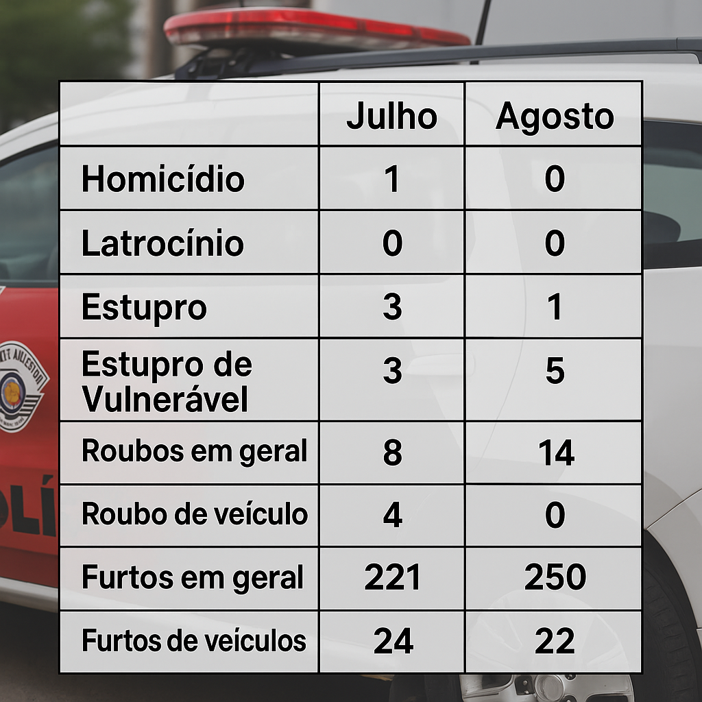 No que se refere a crimes patrimoniais, os roubos em geral aumentaram de 8 para 14 ocorrências, enquanto os roubos de veículo caíram de 4 para zero. Os furtos em geral também cresceram, de 221 em julho para 250 em agosto. Já os furtos de veículos apresentaram ligeira redução, de 24 para 22 casos.