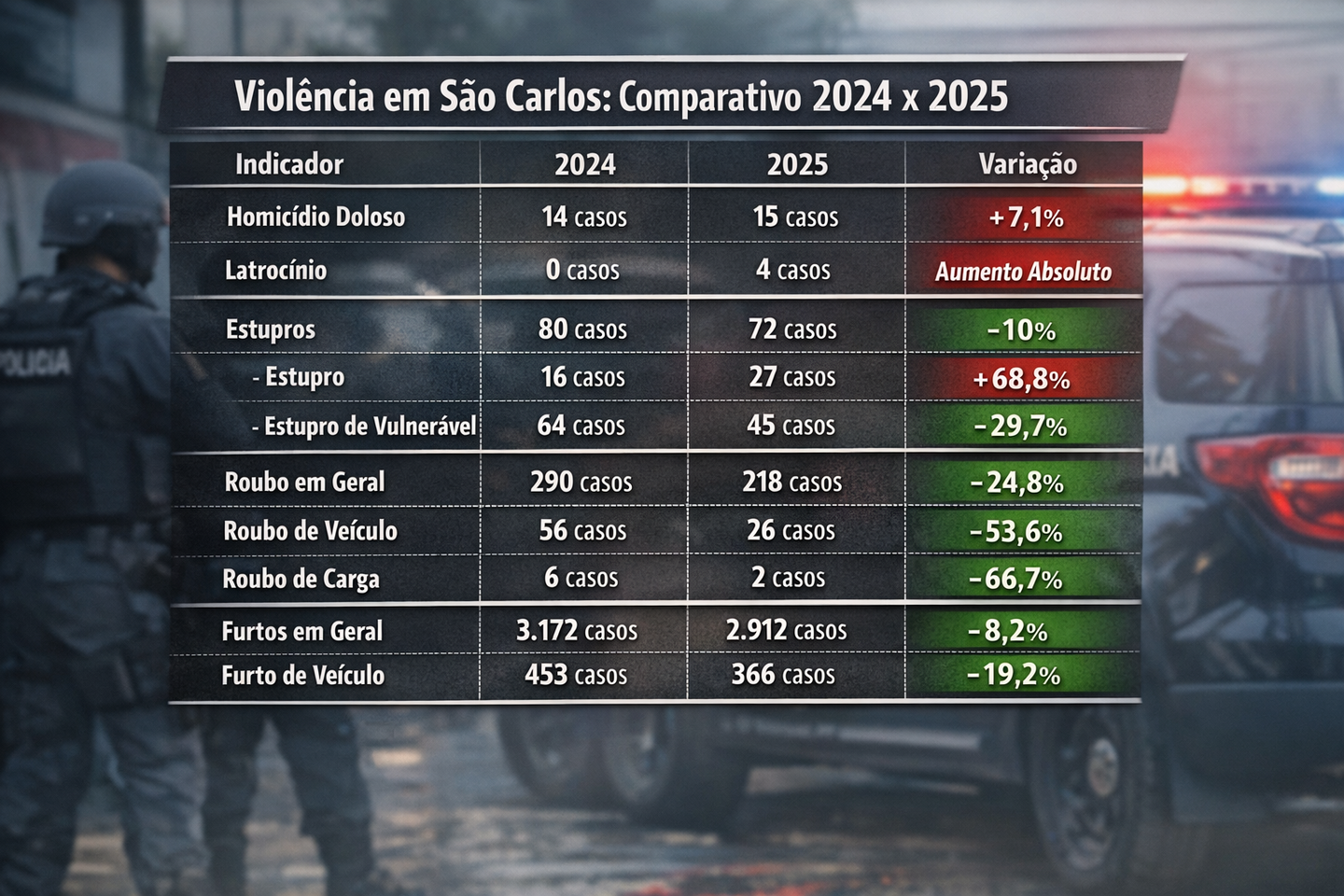 O levantamento mostra que, apesar do aumento nos crimes mais graves contra a vida, São Carlos registrou melhora consistente nos índices de roubos e furtos em 2025, indicando uma mudança no perfil da criminalidade na cidade.