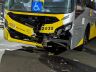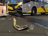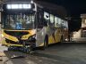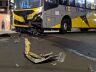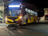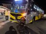 As imagens mostram o motorista do coletivo sinalizando a manobra com a seta. Com o impacto, a frente do ônibus ficou destruída