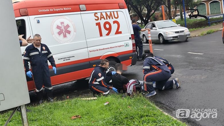 Motociclista é atendido por socorrista antes de ser encaminhado à Unimed - Crédito: Maycon MaximinoCom possível fratura em um dos pés, um motociclista de 24 anos foi vítima de um acidente nesta sexta-feira, na região da USP São Carlos.