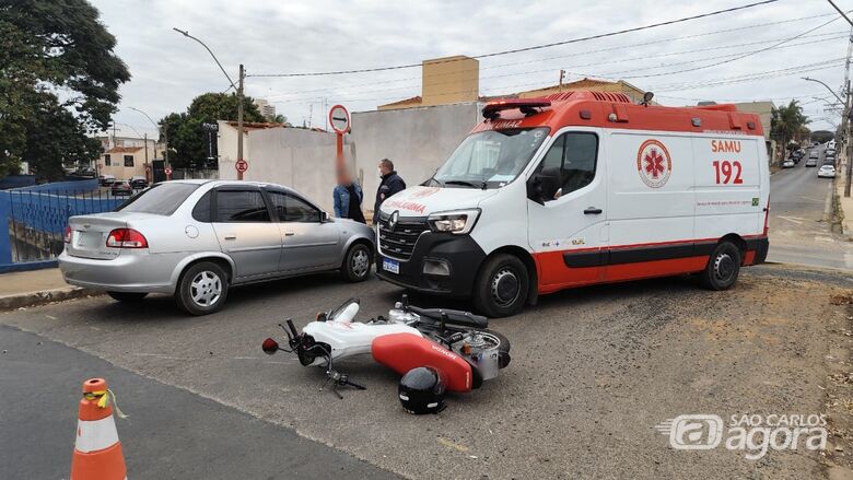 Crédito: Maycon MaximinoNa manhã desta segunda-feira (14), um acidente de trânsito foi registrado na esquina da Avenida Comendador Alfredo Maffei com a Rua Dom Pedro II, no centro de São Carlos. A colisão envolveu uma motocicleta e um carro que trafegavam pela avenida no sentido bairro-centro.