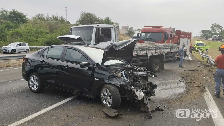 Carro ficou destruído devido à forte pancada contra caminhão na SP-310 - Crédito: Maycon MaximinoUm acidente na tarde desta quinta-feira, 10, resultou em uma mulher de 30 anos ferida no km 232 na rodovia Washington Luís (SP-310), sentido interior/capital (região da rotatória que dá acesso ao Conjunto Residencial Maria Stella Fagá).