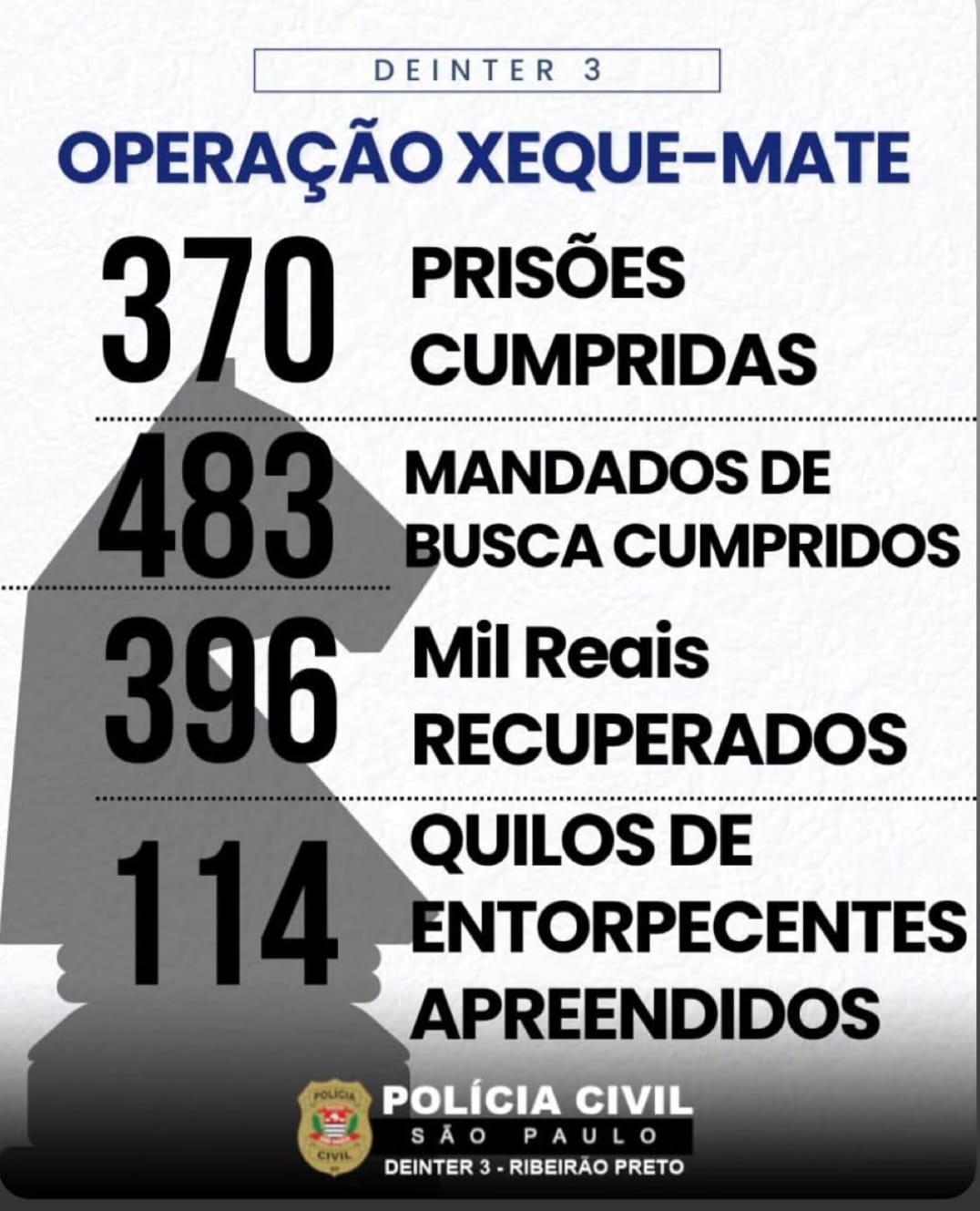Delegacia Seccional São Carlos - Crédito: arquivoO Departamento de Polícia Judiciária de São Paulo Interior – Deinter 3, com sede em Ribeirão Preto, desencadeou uma ampla ação policial denominada Operação Xeque-Mate, que resultou em números expressivos no combate à criminalidade em toda a região. A operação contou com a integração de diversas Delegacias Seccionais, abrangendo 93 municípios do interior paulista, entre eles Araraquara, Barretos, Bebedouro, Franca, Ribeirão Preto, São Carlos, São Joaquim da Barra e Sertãozinho.