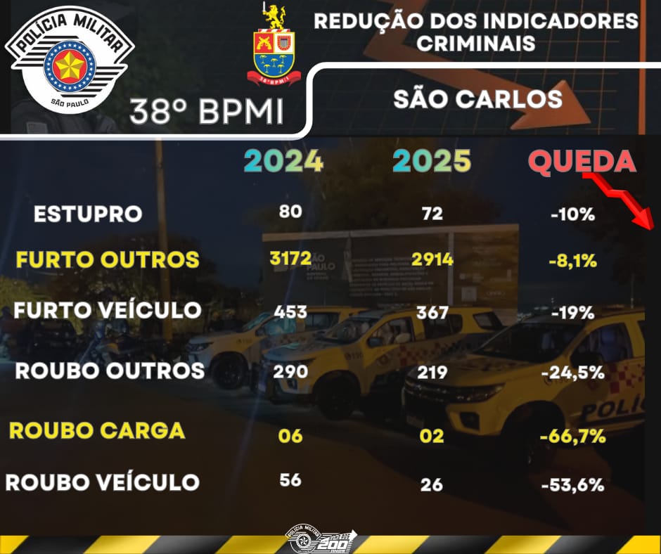 O 38º Batalhão da Polícia Militar do Estado de São Paulo, com sede em São Carlos, registrou uma redução importante em todas as principais modalidades de crime. Foi registrada uma queda de 53,6% no roubo de veículos em 2025, em comparação ao mesmo período do ano anterior. Em 2024, foram registrados 56 casos e, em 2025, apenas 26. O batalhão é comandado pelo tenente-coronel César Alexandre Cardeal.