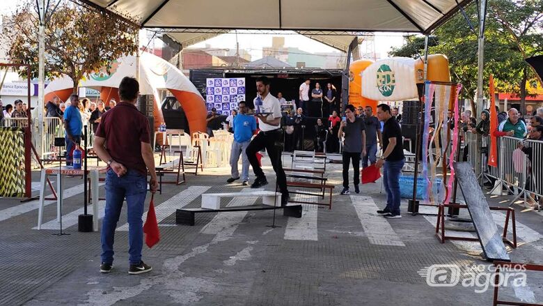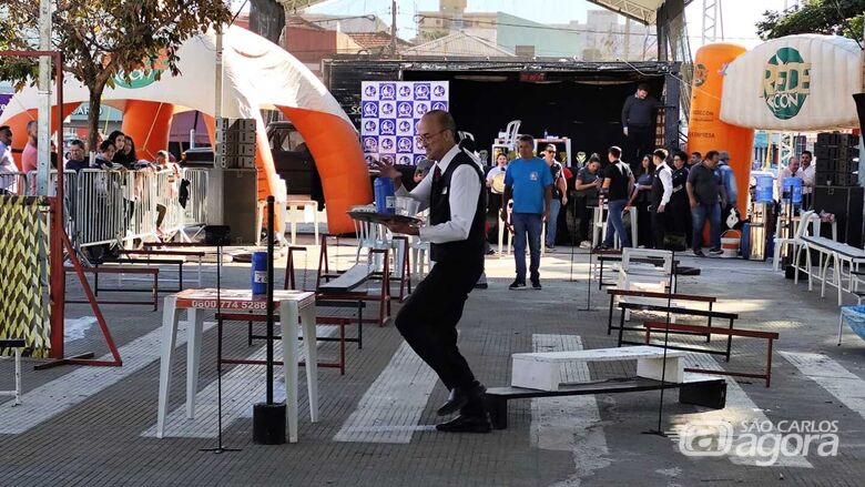 Garçom Cross foi realizado na Praça do Mercado - Crédito: Maycon MaximinoNesta segunda-feira (11), São Carlos sediou a 32ª edição do Garçom Cross, evento tradicional que aconteceu na Praça Maria Aparecida Resitano, conhecida como Praça do Mercado. A competição reuniu 24 profissionais da área, entre homens e mulheres, que encararam um circuito com provas de obstáculos, equilibrando bandejas com copos e garrafas.