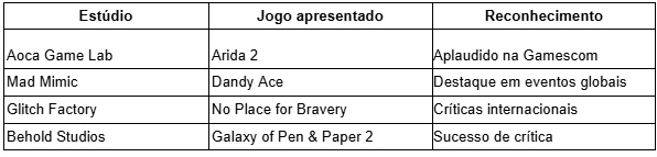 Os estúdios brasileiros estão a conquistar o seu espaço no mercado global, demonstrando criatividade e inovação que impressionam. Durante a Gamescom Latam 2025, muitos deles apresentaram títulos que chamaram a atenção de grandes empresas internacionais, mostrando que o talento nacional é capaz de competir com os melhores. Jogos como Arida 2, Dandy Ace e No Place for Bravery são apenas alguns exemplos de como os estúdios do Brasil estão a criar experiências imersivas e cativantes.