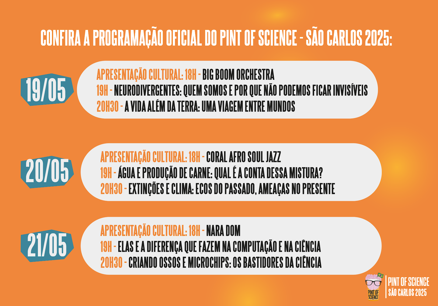 De 19 a 21 de maio, São Carlos se torna um epicentro de conhecimento ao ar livre. No Pint of Science, a ciência não fica restrita aos laboratórios; ela ganha voz, melodia e um espaço para se espalhar pela cidade.