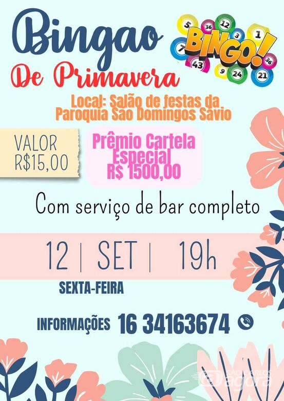 Bingo - A Paróquia São Domingos Sávio realiza, nesta sexta-feira (12), a partir das 19h, o tradicional Bingão de Primavera, evento que já faz parte do calendário comunitário e promete reunir famílias e amigos em uma noite de lazer, prêmios e confraternização.