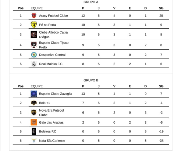 Já o Grupo B está praticamente definido, com Zavaglia, Bola+1 e Nova Era confirmados nas oitavas. Galo das Arábias, Boleiros e Nata São-carlense lutam pela quarta vaga.
