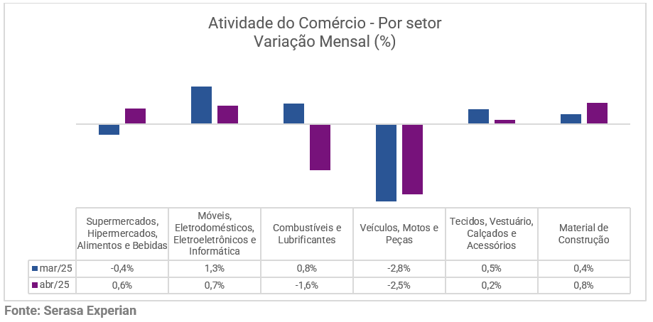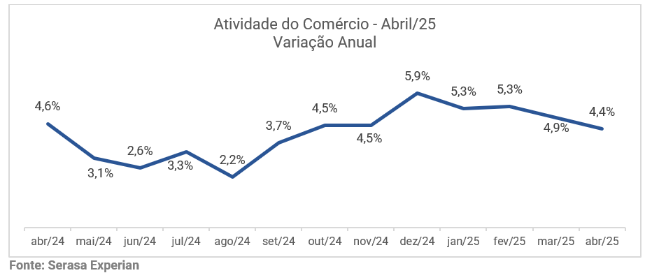 No comparativo entre abril deste ano e o mesmo mês de 2024, o crescimento da atividade do comércio físico foi de 4,4%. Veja, a seguir, a variação anual do indicador com histórico dos últimos 12 meses: