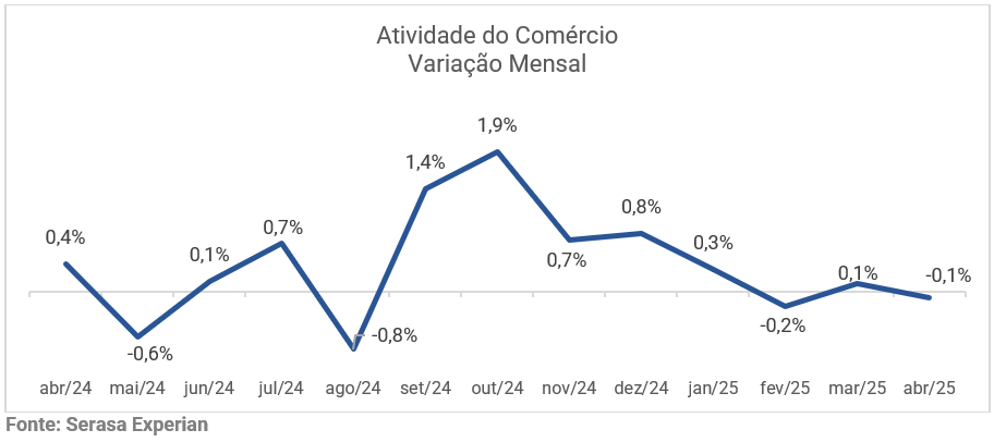 Comércio de Sâo Carlos - Crédito: Arquivo/São Carlos AgoraA atividade do varejo físico brasileiro registrou uma leve retração de 0,1% em abril, na comparação com o mês anterior. Os dados são do Indicador de Atividade do Comércio da Serasa Experian , primeira e maior datatech do Brasil. Veja, o levantamento dos últimos 12 meses, no gráfico a seguir: