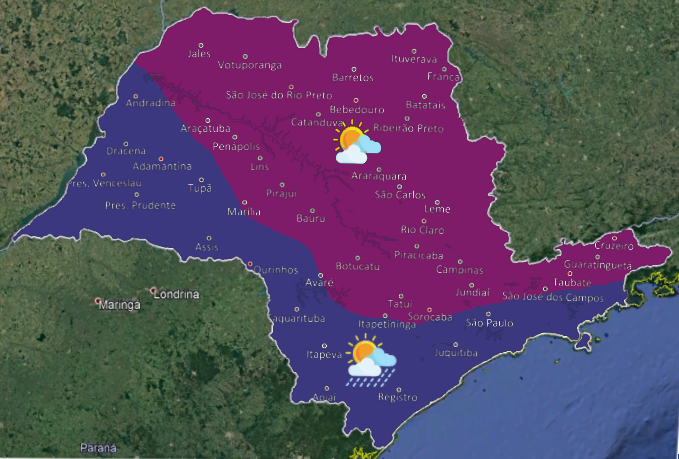 Permanece a condição de Tempo estável com predomínio de sol, pouca nebulosidade e sem previsão de chuva na maioria das regiões do estado de São Paulo, devido a atuação de uma massa de ar seco. Contudo, no oeste e sul do estado, a nebulosidade ficará mais acentuada com previsão para chuvas isoladas em função de um centro de baixa pressão no Paraná. Temperaturas elevadas.
