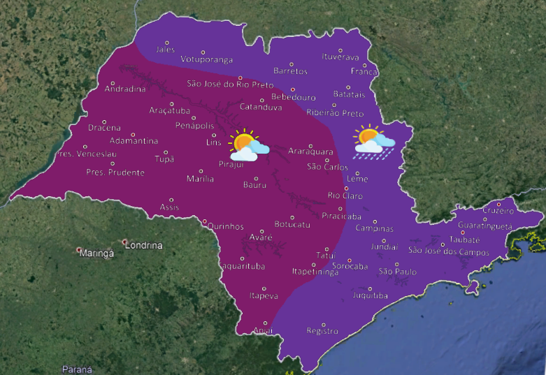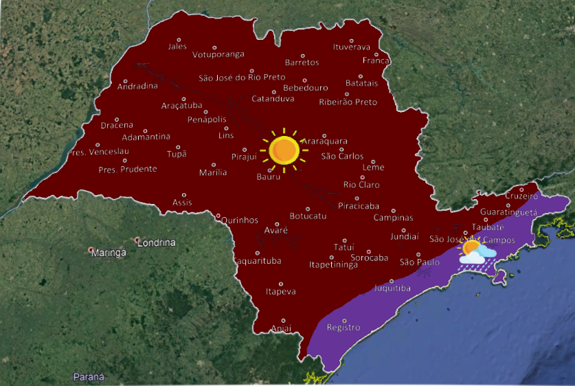 Tempo estável no estado de São Paulo, com predomínio de sol, poucas nuvens e sem chuva no interior paulista, em razão da atuação de uma massa de ar seco. Na faixa leste, céu parcialmente nublado com chuvas em pontos isolados. Temperaturas continuam em elevação. (IPMET)
