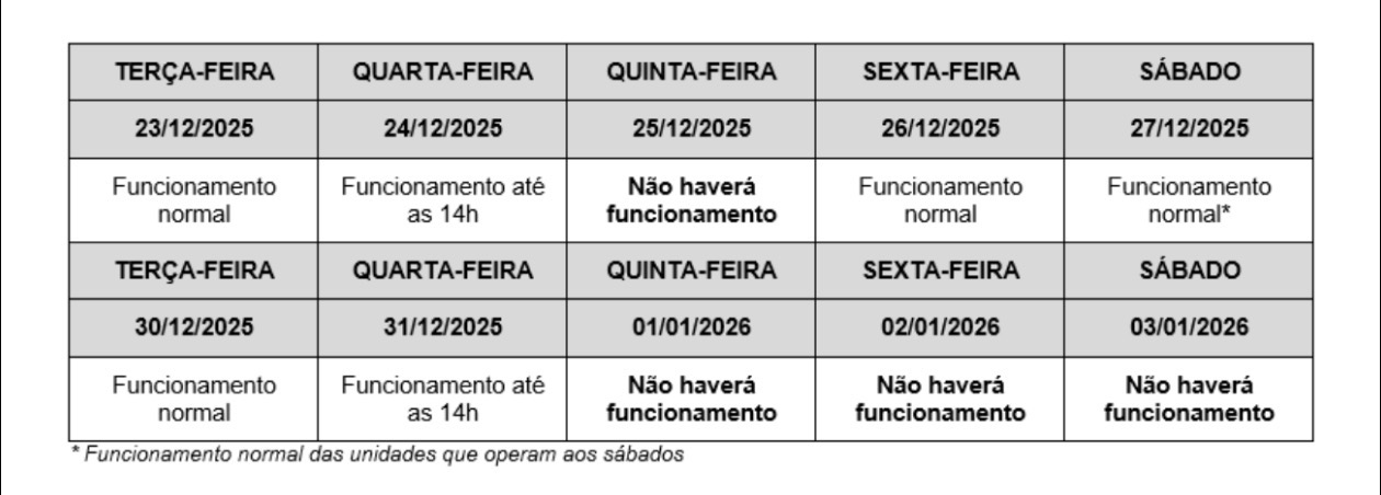 Nos demais dias do período de fim de ano, as unidades funcionarão conforme tabela operacional definida pela empresa, respeitando os horários específicos de cada agência. As entregas de cartas e encomendas seguirão o mesmo esquema de funcionamento adotado pelas agências.