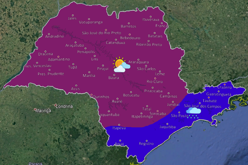 Tempo estável na maior parte do interior do estado de São Paulo, com sol, poucas nuvens e sem chuva. Na região sul e na faixa leste paulista, a nebulosidade aumenta no decorrer do dia e há previsão de chuvas fracas e isoladas, devido à circulação dos ventos de sul que trazem umidade do oceano para o continente e aproximação de uma nova frente fria, que chegará ao litoral paulista na terça-feira. Temperaturas seguem elevadas