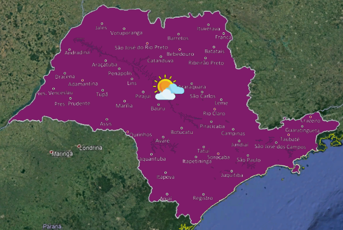 Tempo estável no Estado de São Paulo. Céu com pouca nebulosidade e sem previsão de chuva no período. Temperaturas em elevação.