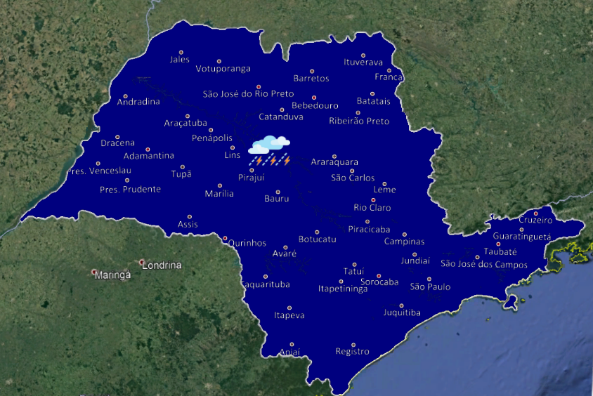 Nova frente fria atinge o Estado de São Paulo, ocasionando aumento da nebulosidade e áreas de chuvas com trovoadas, a partir do oeste paulista.
