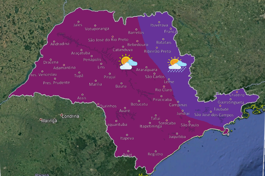 A semana começa com pouca nebulosidade e sem chuva no estado de São Paulo. Contudo, com o enfraquecimento do sistema de alta pressão e elevação das temperaturas, pancadas de chuva de forma isolada, algumas com forte intensidade, se formam em várias regiões paulistas entre os períodos da tarde e da noite.