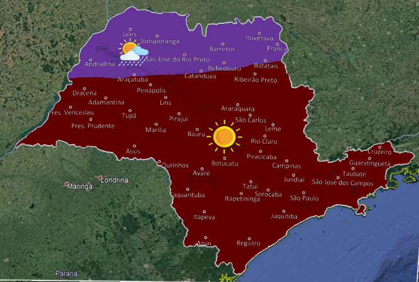A semana começa com Tempo estável na maior parte do estado de São Paulo, com predomínio de sol, céu claro a poucas nuvens e sem chuva no período da manhã. Contudo, , pancadas de chuvas isoladas são previstas no noroeste e oeste paulista, divisa com o Mato Grosso do Sul. As temperaturas seguem elevadas.