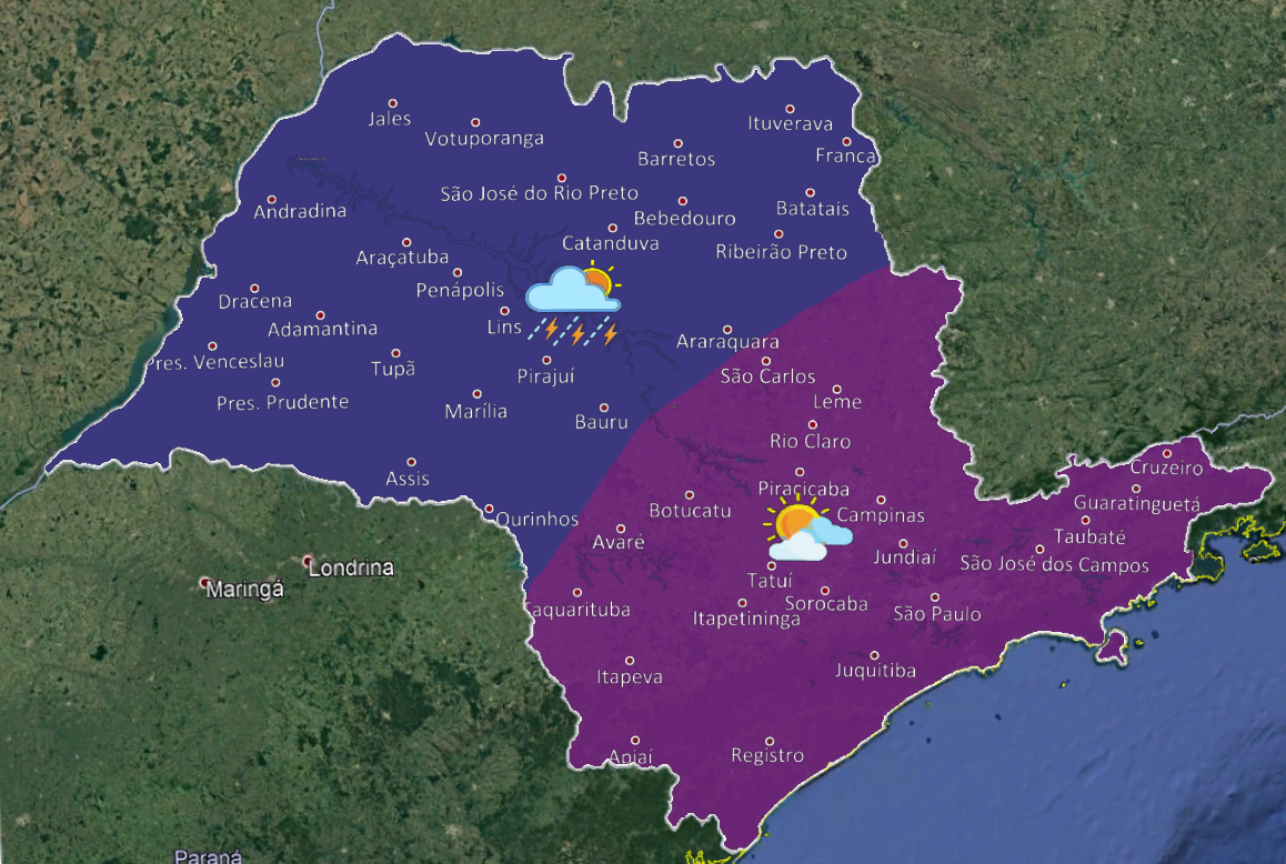 O dia começa com céu claro a poucas nuvens, sem chuva, no estado de São Paulo, e com temperaturas amenas, devido à atuação da massa de ar frio em dissipação. No decorrer da noite, a formação de um sistema de baixa pressão sobre o continente, entre o Paraguai e o Paraná, causará instabilidades no estado de São Paulo, a partir da região oeste, com aumento da nebulosidade e chuvas isoladas, algumas com trovoadas. Temperaturas em elevação durante o dia.