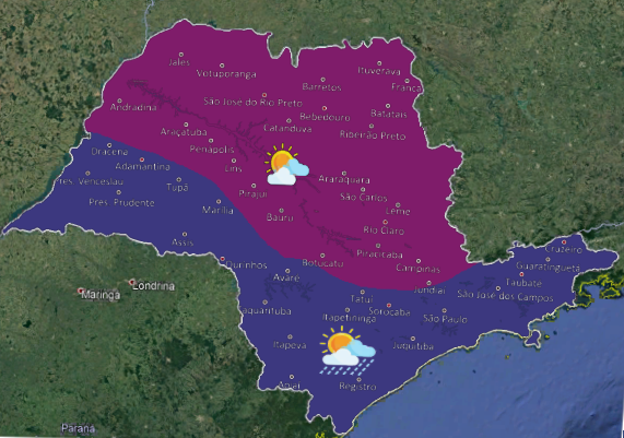 A semana começa com Tempo estável em grande parte do estado de São Paulo, com predomínio de sol, poucas nuvens e sem previsão de chuva. Contudo, no decorrer da tarde, há previsão de áreas de chuvas, principalmente na faixa leste e no sul do estado, devido a instabilidades vindas do oceano, em razão da formação de um centro de baixa pressão, próximo ao litoral paulista. As temperaturas continuam elevadas.