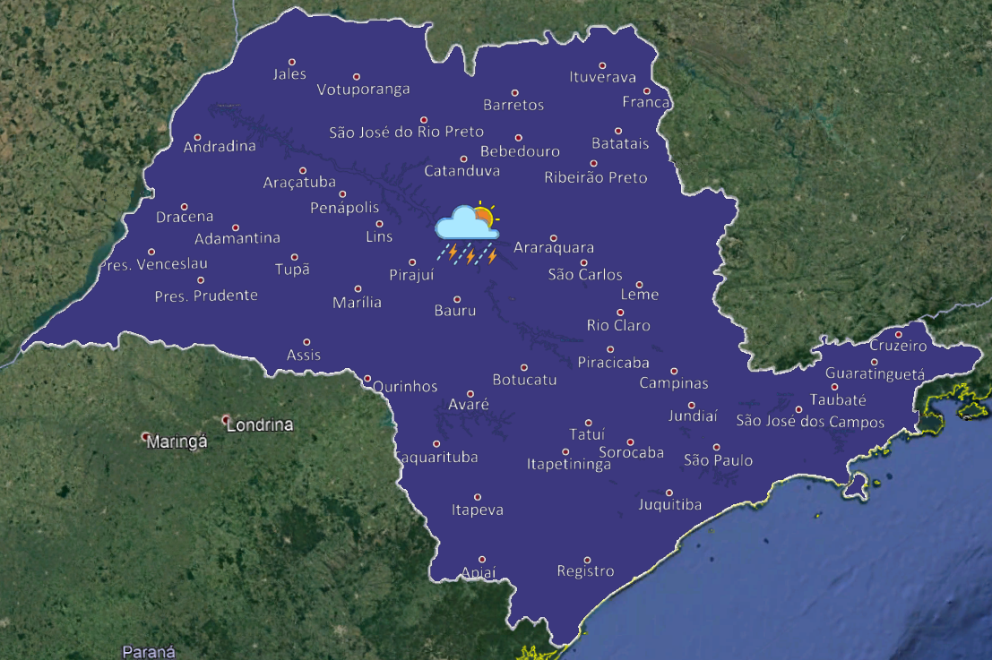 A condição de instabilidade retorna gradualmente ao estado de São Paulo, mantendo o céu parcialmente nublado e com áreas de chuvas em algumas regiões paulistas no período da manhã. A partir da tarde, áreas de instabilidade se propagam pelo estado, provocando chuvas e trovoadas isoladas. Temperaturas em ligeiro declínio. (ipmet)