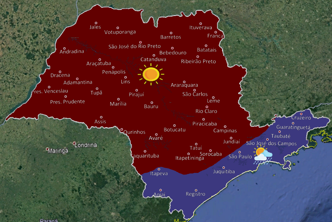 A atuação de um sistema de alta pressão no estado, com massa de ar frio associada, de São Paulo, mantém os próximos dias com céu claro a poucas nuvens e sem previsão de chuva em grande parte do estado de São Paulo, principalmente no interior paulista. Com isso, são esperadas temperaturas amenas e rajadas de ventos mais constantes em todo o estado. Na faixa leste (litoral, capital e Vale do Paraíba), a nebulosidade fica variável e há previsão para chuvas fracas e isoladas, devido à circulação dos ventos úmidos do oceano para o continente.