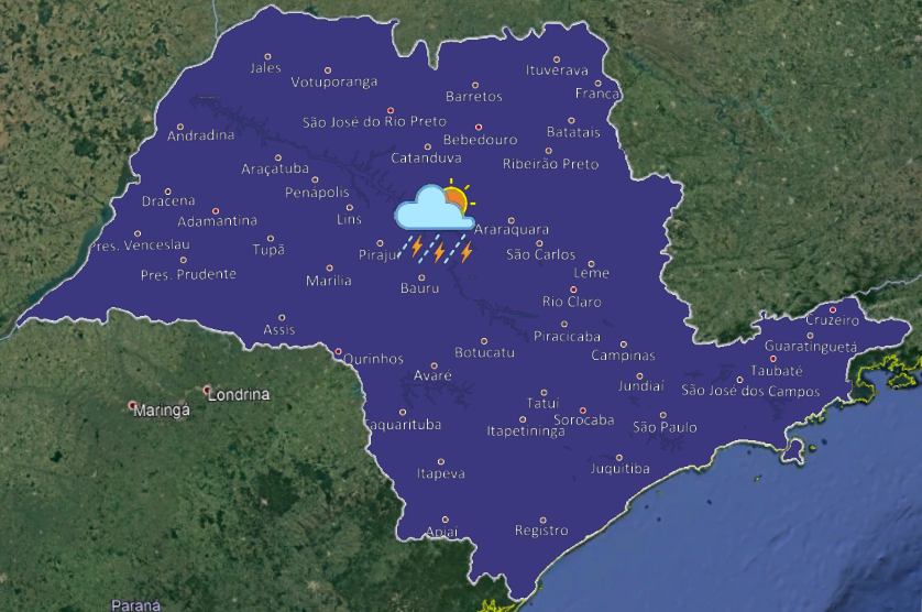 O dia de sexta-feira começa com céu claro a parcialmente nublado na maior parte do estado de São Paulo. Contudo, áreas de instabilidade se formam a partir do oeste paulista, causando chuvas com trovoadas isoladas e descargas elétricas ocasionais, principalmente entre os períodos da tarde e da noite. Temperaturas continuam elevadas.