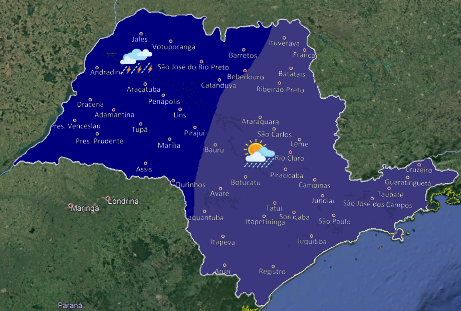 A condição de instabilidade continua no estado de São Paulo, principalmente no setor oeste do estado, que começa o dia com áreas de chuvas e trovoadas isoladas. Nas demais regiões, sol entre nuvens, com previsão de chuvas mais intensas, a partir da tarde. Temperaturas máximas com ligeira elevação.