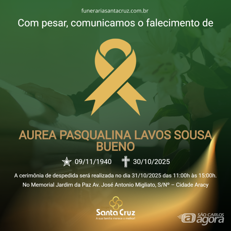 É com grande pesar que o Grupo Santa Cruz informa o falecimento da Sra. Aurea Pasqualina Lavos Sousa Bueno, aos84 anos de idade, ocorrido no dia 30/10/2025, na cidade de São Carlos.