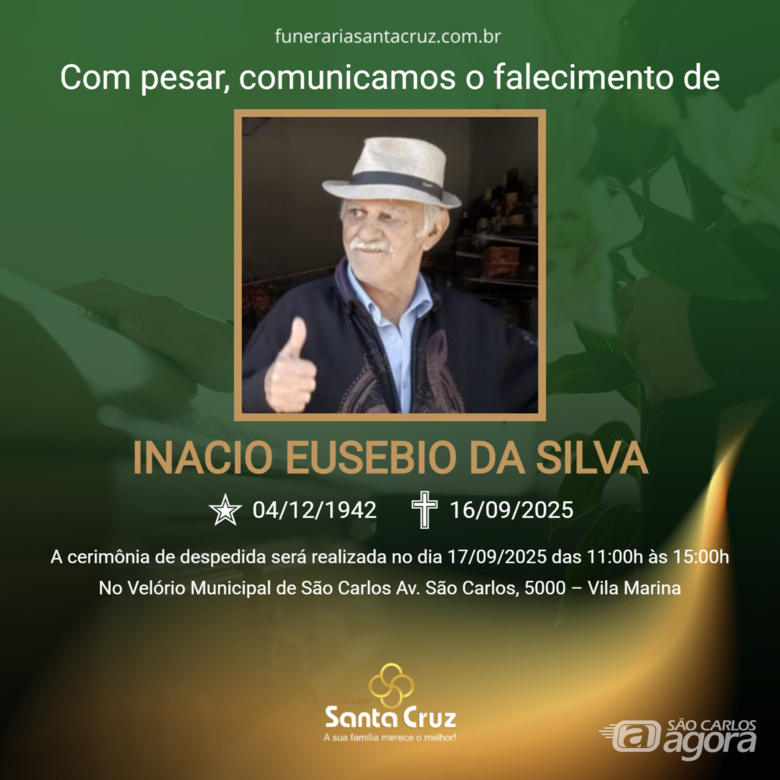 É com grande pesar que o Grupo Santa Cruz informa o falecimento do Sr. Inacio Eusebio da Silva, aos 82 anos de idade, ocorrido no dia 16/09/2025, na cidade de Américo Braisliense.