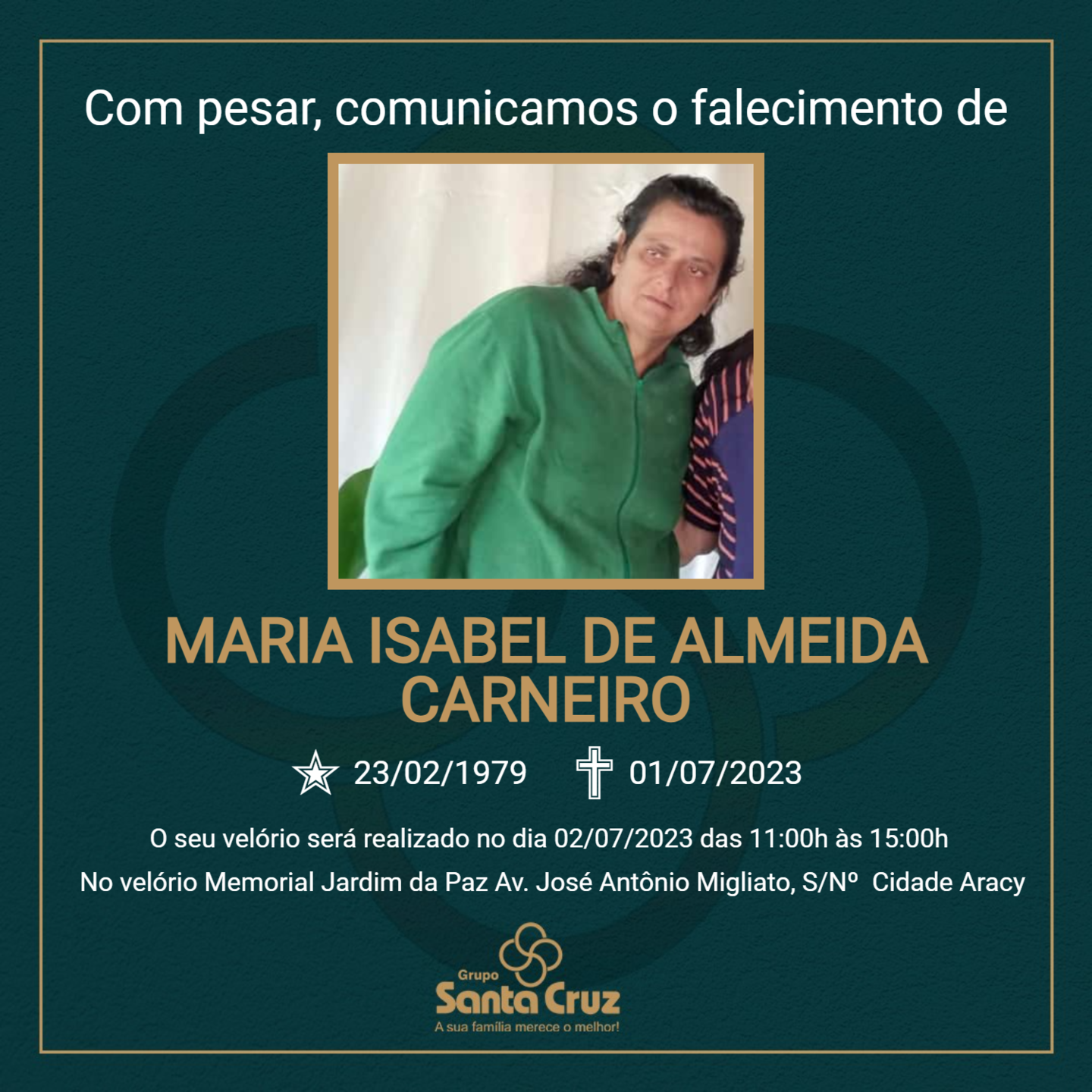Faleceu no dia 01/07/2023 na cidade de São Carlos, a Sra. Maria Isabel de Almeida Carneiro, nascida em 23/02/1979 com 44 anos de idade.