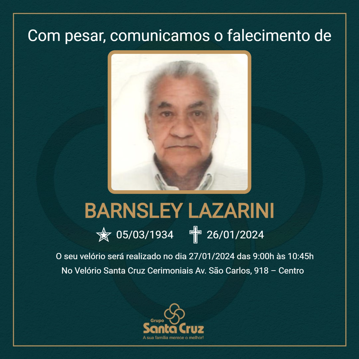 Faleceu no dia 26/01/2024 na cidade de São Carlos, o Sr Barnsley Lazarini, nascido em 05/03/1934 com 89 anos.